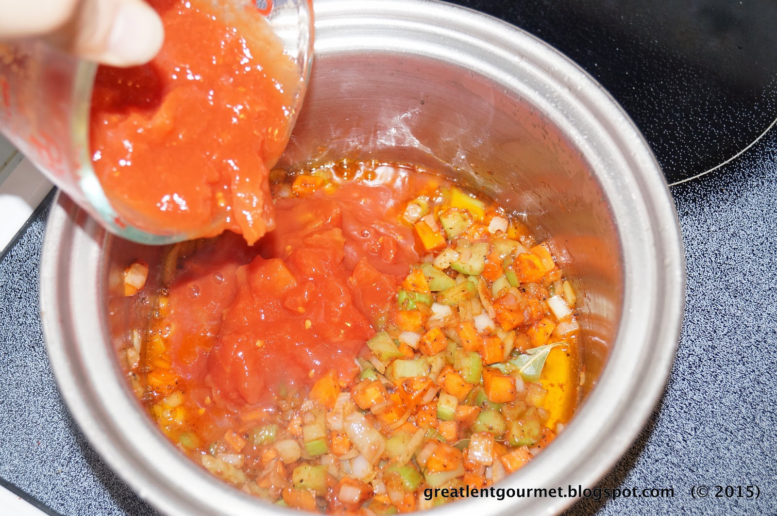 Then, add the diced tomatoes. Add the bay leaf, too. We use a Greek Bay Leaf, which we will discuss on another day. It is much more flavourful than the small non-Greek ones. My mother-in-law tells me that she sometimes uses crushed tomatoes in a can, or she will get the tomatoes that have been put in the freezer from the summer garden, and she will spend her time to grate the frozen tomatoes for this recipe. The tomatoes from the garden do give the soup a different taste, and if I knew how to spell my mother-in-law's description, I would; but I can tell you that it is similar to, "Yummm."